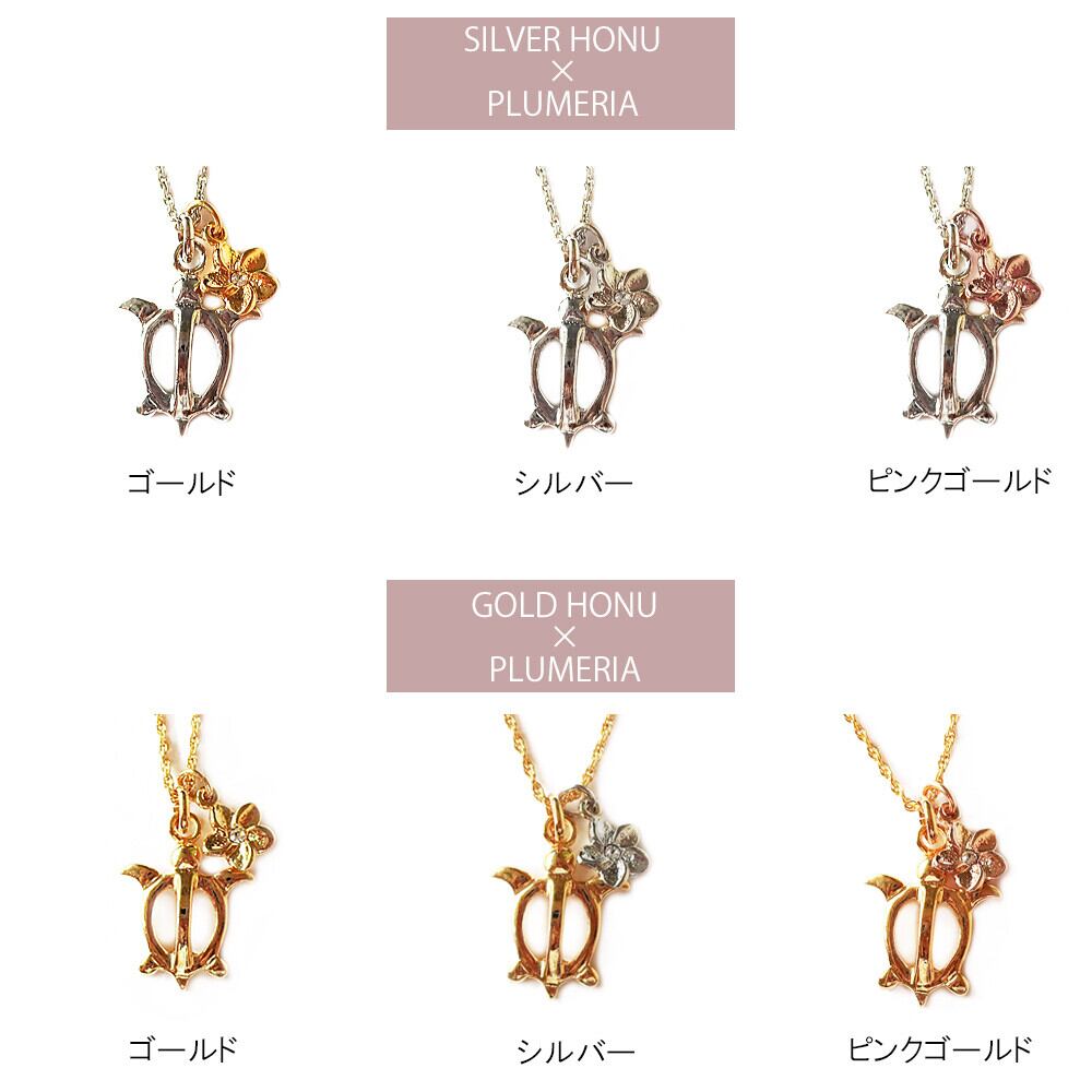 ■ホヌ・・・海亀はハワイではホヌと呼ばれ海の守り神とされています。お守りとしても人気のモチーフです。 ■プリメリア・・・ハワイの代表的な花「プルメリア」中央にはストーンが1石が配されています。